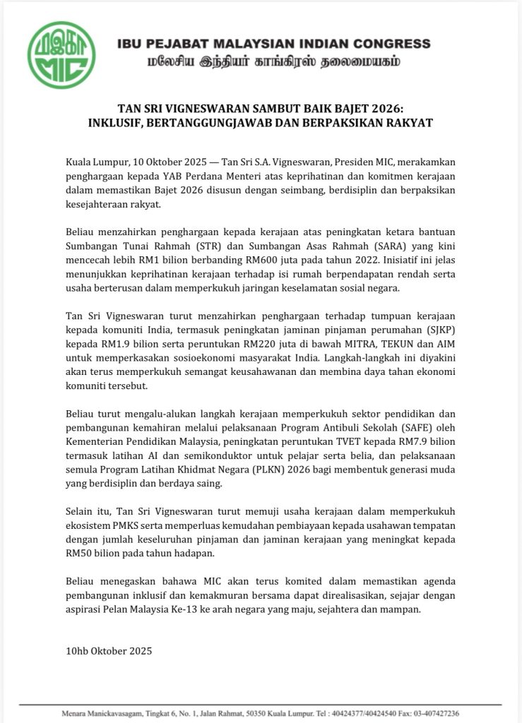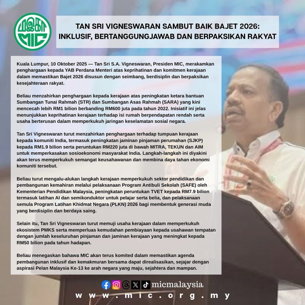 Kuala Lumpur, 10 Oktober 2025 — Tan Sri S.A. Vigneswaran, Presiden MIC, merakamkan penghargaan kepada YAB Perdana Menteri atas keprihatinan dan komitmen kerajaan dalam memastikan Bajet 2026 disusun dengan seimbang, berdisiplin dan berpaksikan kesejahteraan rakyat.
