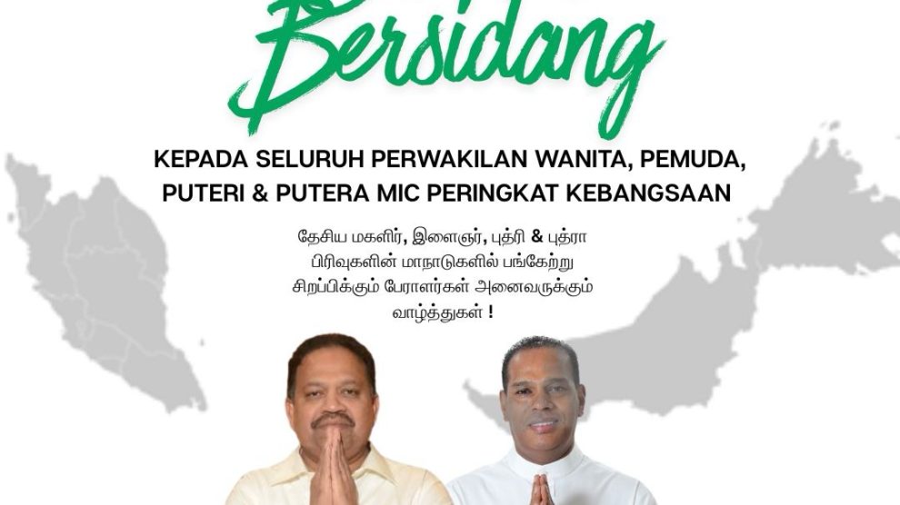 Selamat Bersidang kepada Seluruh Perwakilan Wanita, Pemuda, Puteri & Putera MIC Peringkat Kebangsaan. தேசிய மகளிர், இளைஞர், புத்ரி & புத்ரா பிரிவுகளின் மாநாடுகளில் பங்கேற்று சிறப்பிக்கும்...
